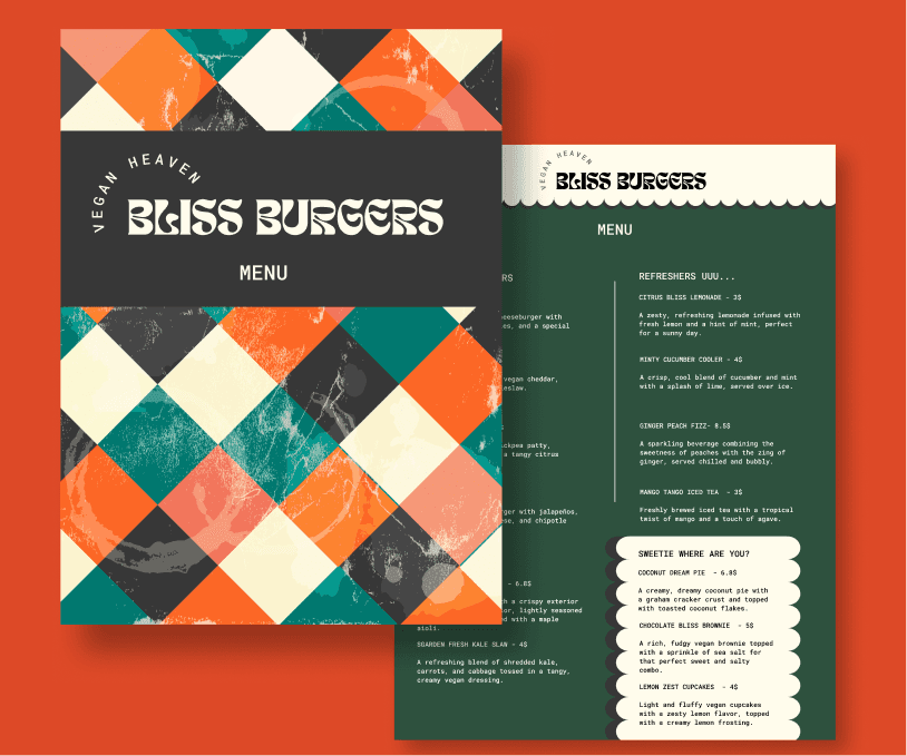Bliss Burgers – Vegan Heaven: a retro‑inspired vegan burger brand blending nostalgic diner vibes with a modern, plant‑based twist—full identity from logo to interiors and menu.